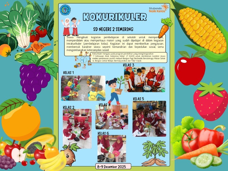 Situbondo – SD Negeri 2 Semiring melaksanakan kegiatan kokurikuler sebagai bagian dari penguatan proses pembelajaran dan pengembangan potensi peserta didik. Kegiatan ini diikuti oleh seluruh siswa dengan pendampingan guru sesuai bidang masing-masing.